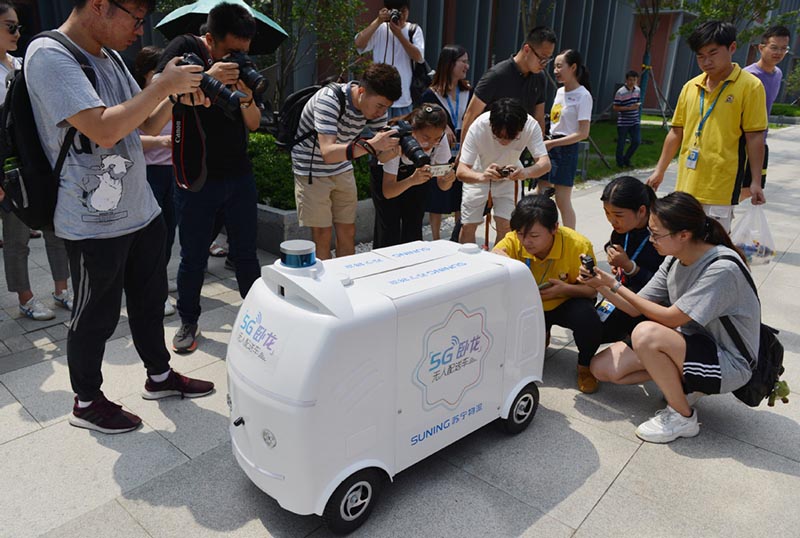 Un vehículo Suning de reparto y habilitado con 5G se prueba en una calle de Nanjing, provincia de Jiangsu. [Foto: Fang Dongxu/China Daily]