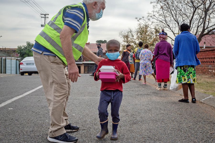 Imagen del 19 de mayo de 2020 de un ni?o que porta una mascarilla recibiendo alimentos gratis de la comunidad, en Johannesburgo, Sudáfrica. (Xinhua/Yeshiel)