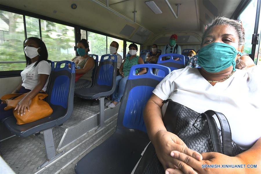 Imagen del 2 de junio de 2020 de trabajadores de la salud del policlínico de Alamar sentados a bordo de un autobús de la empresa china Yutong, en la terminal de Guanabo, en La Habana, capital de Cuba. La empresa china Yutong ha donado mascarillas sanitarias para todos los choferes del transporte público cubano para protegerlos de la pandemia de la enfermedad causada por el nuevo coronavirus (COVID-19). En la terminal de Guanabo se entregan con regularidad las mascarillas donadas por la empresa a los 84 choferes del centro, quienes conducen 57 autobuses Yutong. (Xinhua/Joaquín Hernández)