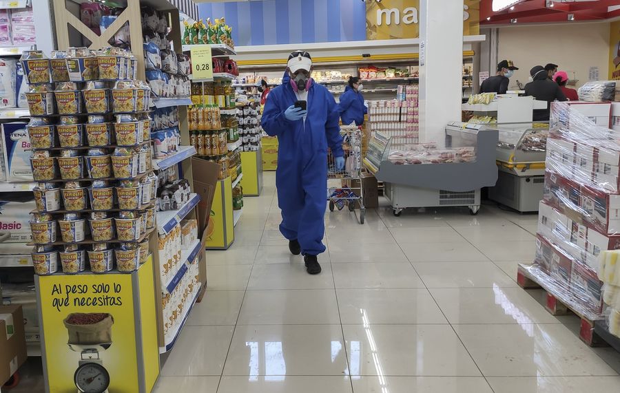 Imagen tomada con un dispositivo móvil de un residente protegido con una máscara mientras realiza la compra de alimentos, en Quito, capital de Ecuador, el 5 de abril de 2020. (Xinhua/Santiago Armas)