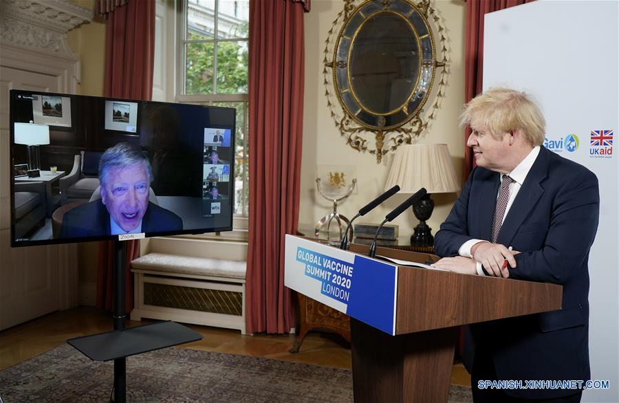 El primer ministro británico, Boris Johnson (d), observa el discurso de Bill Gates durante la Cumbre Global Virtual sobre Vacunas en el número 10 de la calle Downing en Londres, Reino Unido, el 4 de junio de 2020. Johnson inauguró el jueves virtualmente la Cumbre Global sobre Vacunas y exhortó a los países y organizaciones a comprometer financiamiento para inmunizaciones con el fin de salvar millones de vida en los países más pobres y proteger al mundo de futuros brotes de enfermedades infecciosas. (Xinhua/Andrew Parsons/Número 10 de la calle Downing)