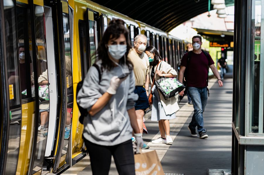 Pasajeros portan mascarillas mientras salen de un vagón de metro en Berlín, capital de Alemania, el 27 de abril de 2020. (Xinhua/Binh Truong)