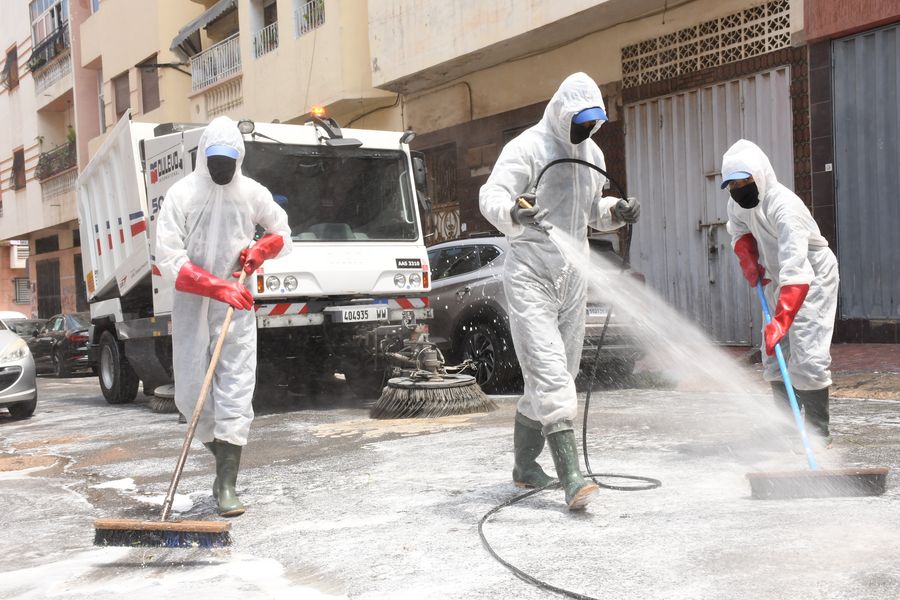 Trabajadores de la salud desinfectan un área pública en Casablanca, Marruecos, el 7 de junio de 2020. (Xinhua/Chadi)