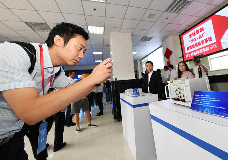 Durante una exposición en Xi'an, un visitante toma una foto de un dispositivo 5G+AI para la gestión ferroviaria, desarrollado conjuntamente por Huawei y la Oficina Ferroviaria de Xi'an, provincia de Shaanxi. [Foto: Xinhua]
