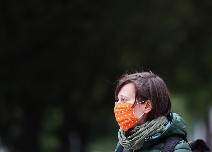 Imagen del 9 de junio de 2020 de una mujer portando una mascarilla mientras camina por una calle en París, Francia. (Xinhua/Gao Jing)