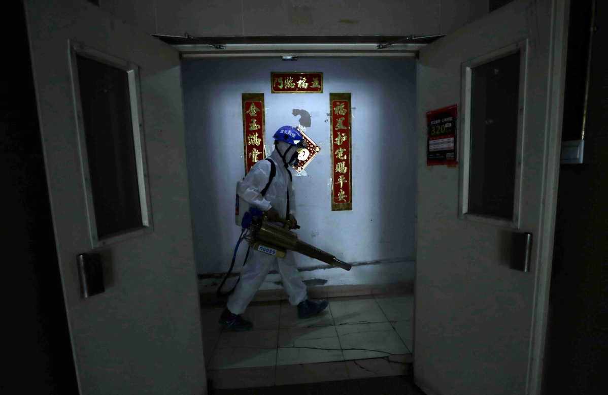 Un miembro del Equipo de Rescate Blue Sky de Beijing desinfecta un edificio en la comunidad Yueyuan en Yuegezhuang, distrito Fengtai de Beijing, el 16 de junio de 2020. [Foto de Zou Hong / chinadaily.com.cn]