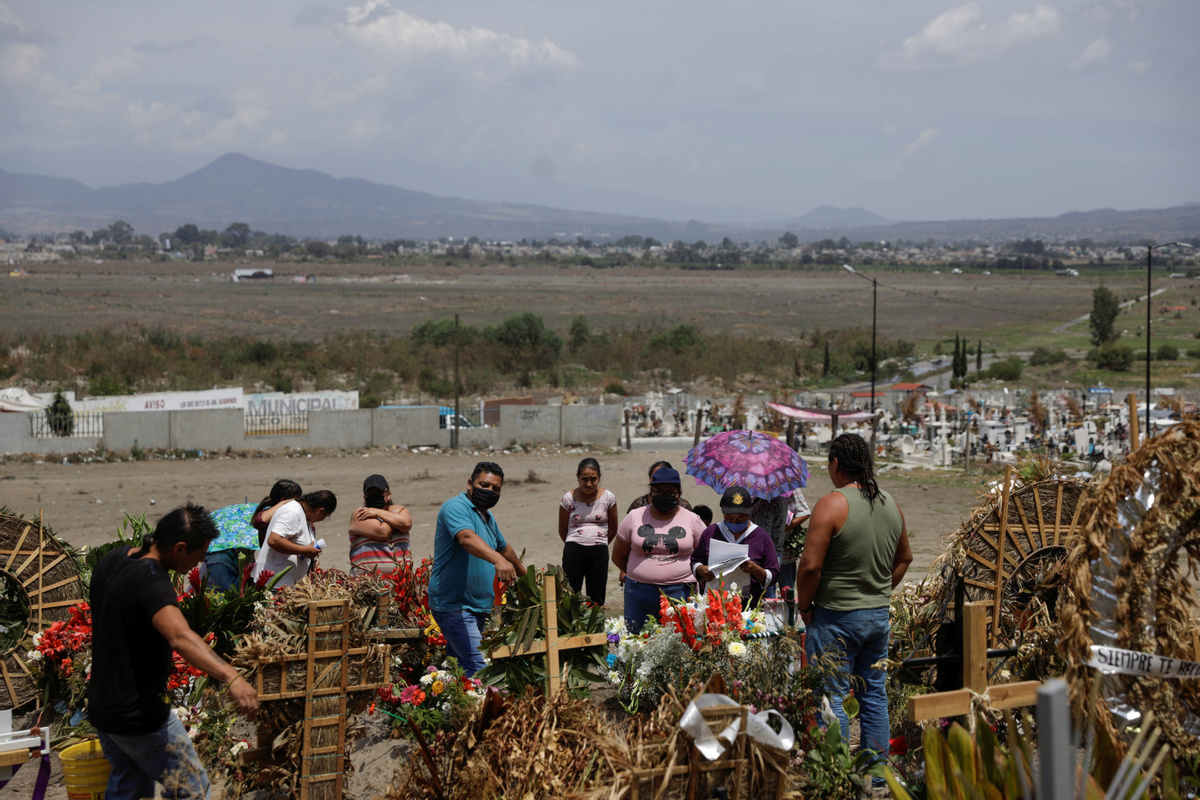 En el cementerio Xico, familiares rezan cerca de la tumba de un pariente que falleció del COVID-19, Estado de México, México, 27 de junio del 2020. [Foto: Agencias]