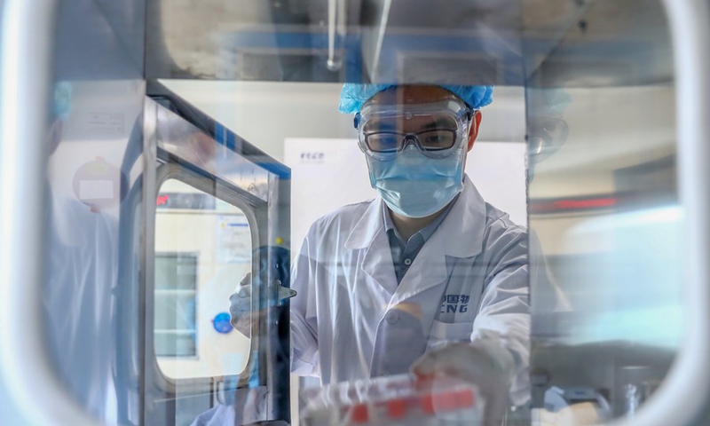 Miembro del personal toma muestras de la vacuna inactivada contra el SARS-CoV-2 en una planta de producción de vacunas de China National Pharmaceutical Group (Sinopharm) en Beijing, 11 de abril del 2020. (Foto: Xinhua)