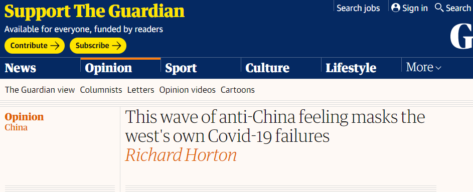 "La actual ola de sentimientos contra China se ha convertido en una sinofobia desagradable, incluso racista, que amenaza la paz y la seguridad internacionales", dijo el Dr. Horton en un artículo de opinión publicado recientemente por el periódico británico The Guardian.