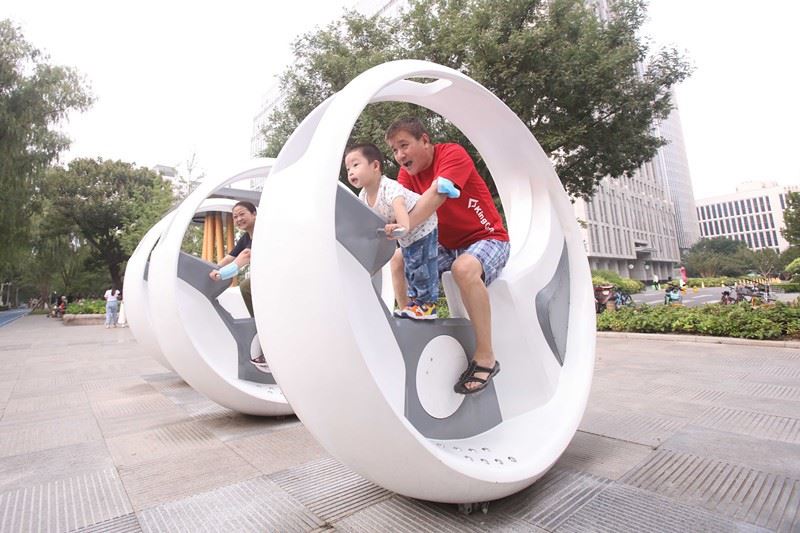 El 6 de agosto, los residentes de Beijing hicieron ejercicio en una bicicleta de spinning en el parque Shuncheng del Distrito Financiero. Chen Xiaogen / Pueblo en Línea