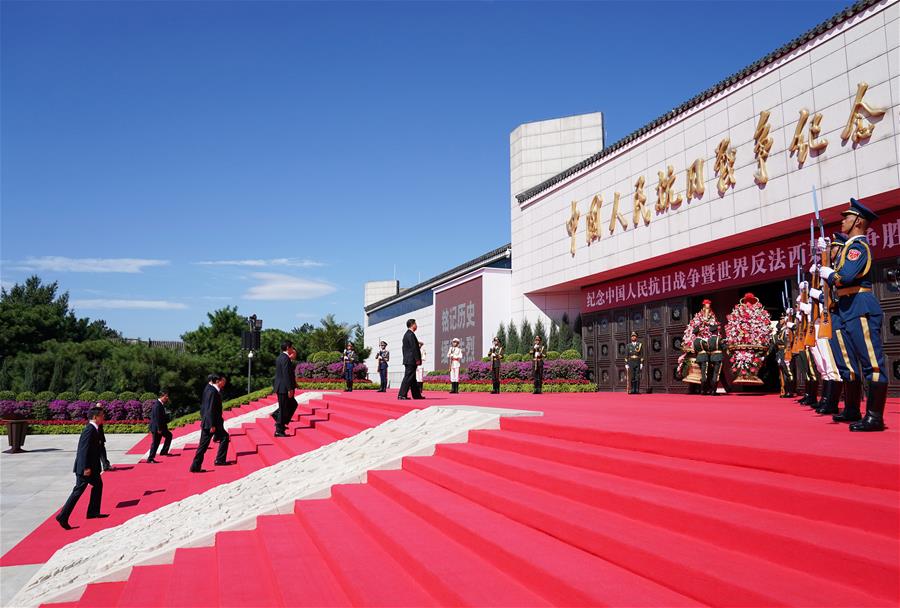 Los líderes chinos, encabezados por Xi Jinping, asisten a un evento conmemorativo con motivo del 75o aniversario de la victoria en la Guerra de la Resistencia del Pueblo Chino contra la Agresión Japonesa y la Guerra Mundial Antifascista en Beijing, capital de China, el 3 de septiembre de 2020. Los otros altos funcionarios presentes en el acto incluyen a Li Keqiang, Li Zhanshu, Wang Yang, Wang Huning, Zhao Leji, Han Zheng y Wang Qishan. El evento se llevó a cabo en el Museo de la Guerra de la Resistencia del Pueblo Chino contra la Agresión Japonesa. (Xinhua/Wang Ye)