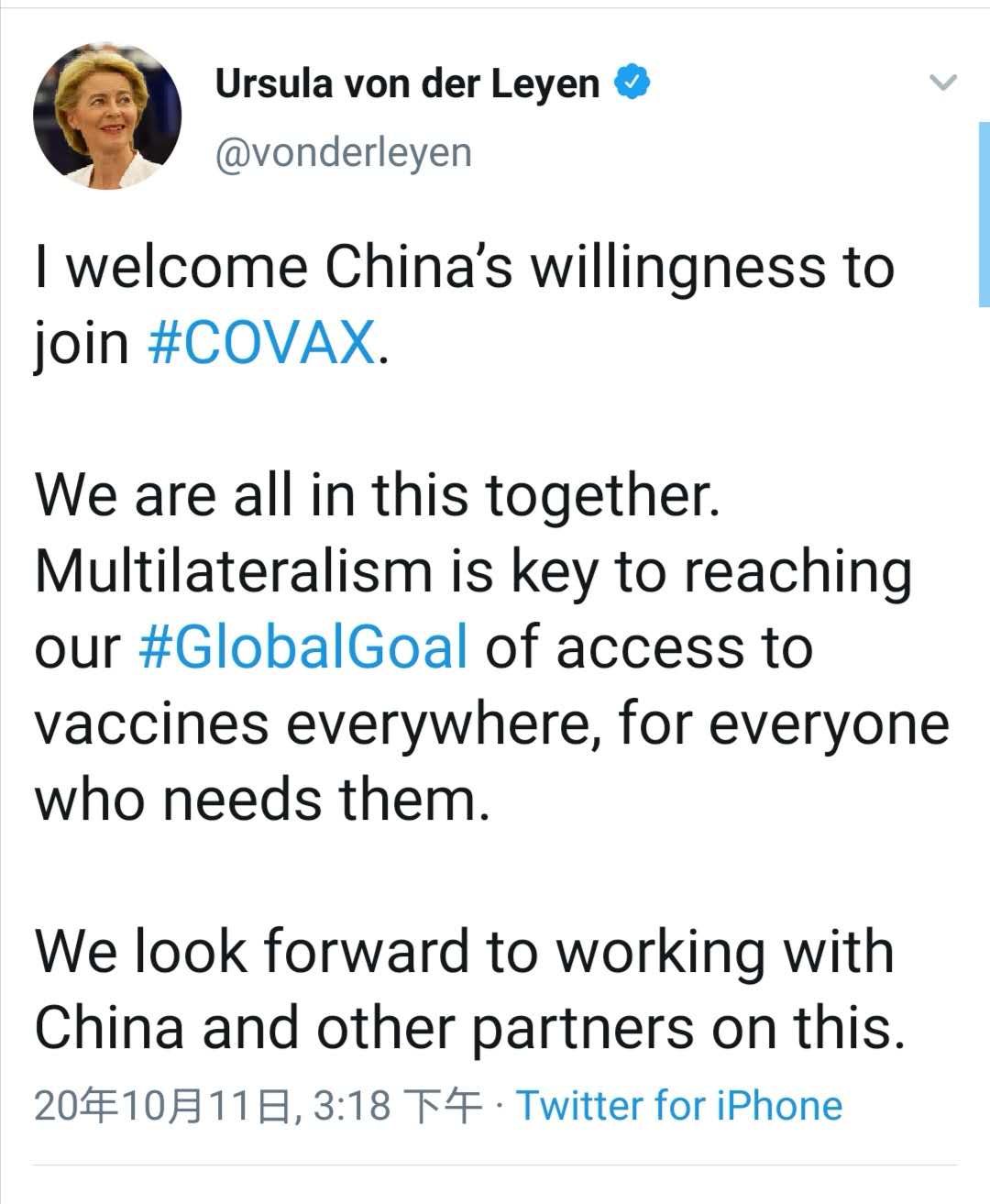 Bruselas, 12/10/2020 (El Pueblo en Línea) -La presidenta de la Comisión Europea, Ursula von der Leyen, celebró este domingo la adhesión de China a COVAX, una iniciativa internacional destinada a garantizar un acceso mundial equitativo a las vacunas contra el COVID-19.