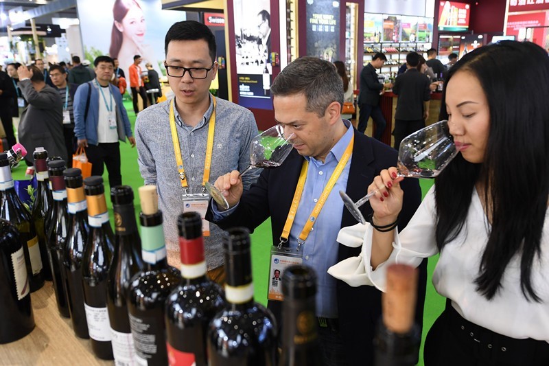 El 9 de noviembre de 2019, en el área de exhibición de alimentos y productos agrícolas de la segunda Exposición Internacional de Importaciones de China, los compradores probaron diferentes tipos de vino. Por Weng Qiyu / vip.people.com.cn
