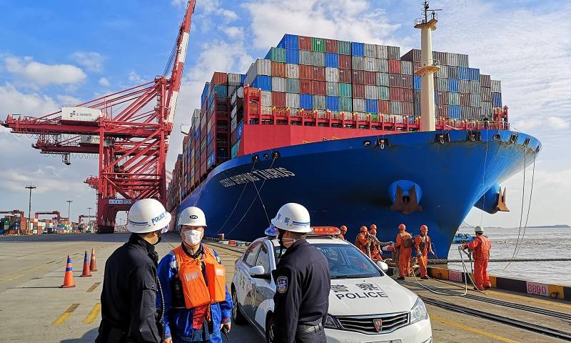 La policía de inspección fronteriza de Shanghai charla con un miembro de la tripulación de un barco que transporta productos de Dinamarca y Alemania, en el puerto de Yangshan, el 20 de octubre. Foto: Zhang Jianjun
