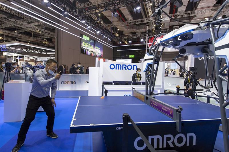 El 5 de noviembre, en el área de exhibición de equipos técnicos de la tercera Exposición Internacional de Importaciones de China, un participante compitió con un robot entrenador de tenis de mesa de la marca Omron. Por Weng Qiyu, Pueblo en Línea