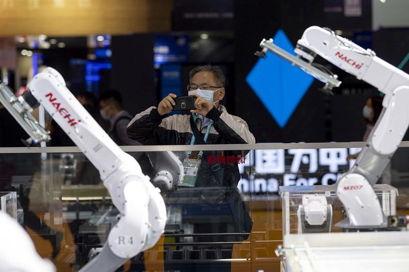 El 5 de noviembre, en el área de exhibición de equipos técnicos de la tercera Exposición Internacional de Importaciones de China, un participante visitó e hizo fotos de la línea de producción no tripulada utilizada para empaquetar productos. Por Weng Qiyu, Pueblo en Línea