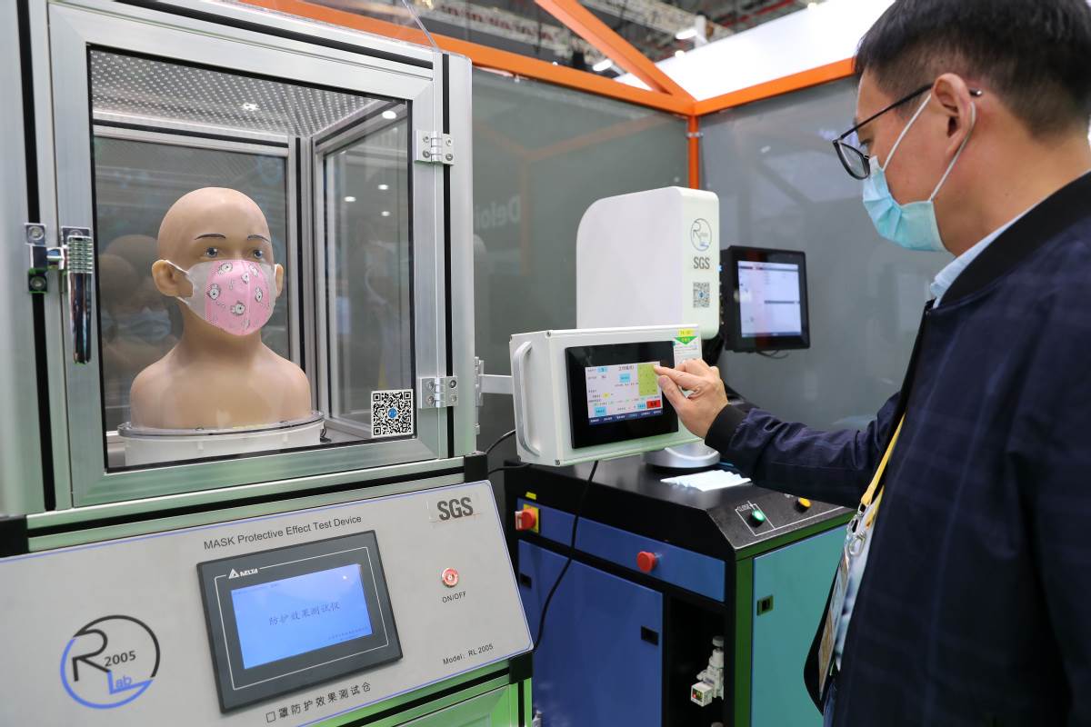 Beijing, 06/11/2020 (El Pueblo en Línea) -Un hombre en la tercera Exposición Internacional de Importaciones de China (CIIE 2020) prueba un dispositivo que evidencia el efecto protector de una máscara, Shanghai, 5 de noviembre del 2020. [Foto: Wang Zhuangfei/ China Daily]