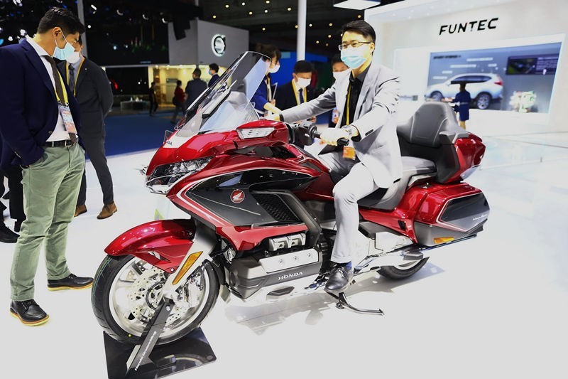 El 5 de noviembre, los participantes experimentan la motocicleta de gran cilindrada de Honda en el área de exhibición de automóviles de la tercera Exposición Internacional de Importaciones de China en Shanghai. Por Zhang Mao, Pueblo en Línea.