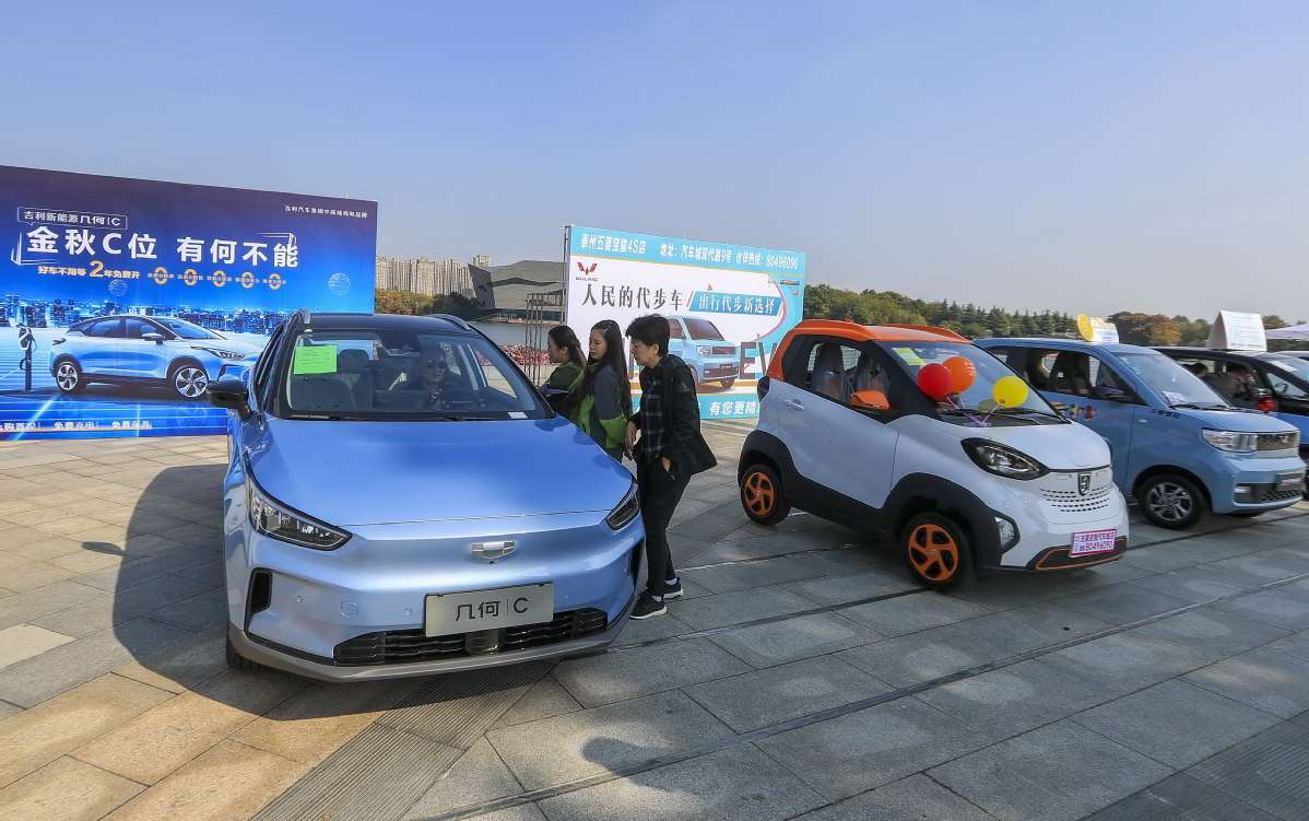 Los compradores potenciales revisan un nuevo vehículo de energía en una feria de automóviles en Taizhou, provincia de Jiangsu, 31 de octubre del 2020. Durante el XIII Plan Quinquenal (2016-20), China destacó el papel de las industrias emergentes estratégicas, incluidos los nuevos vehículos energéticos. [Foto: Tang Dehong/ China Daily]