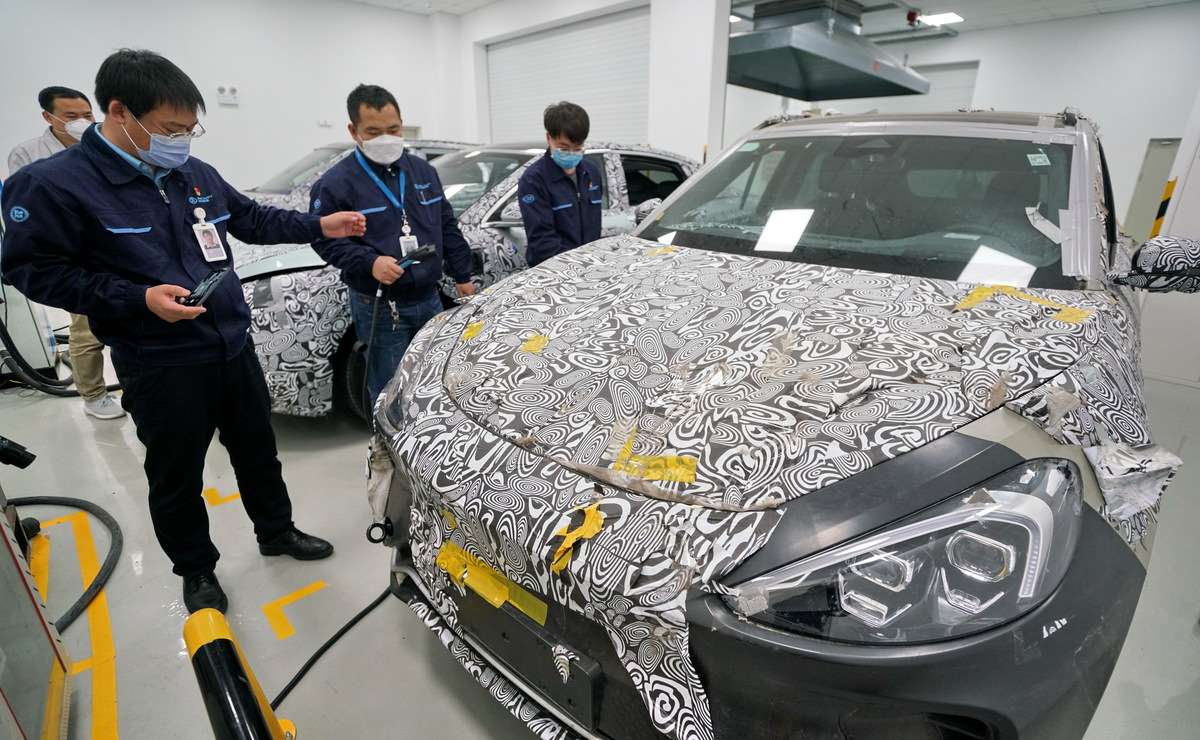 Miembros del personal técnico del centro de I+D de Beijing Electric Vehicle, filial de Beijing Automotive Group, realizan una prueba de carga en un vehículo NEV, 3 de abril del 2020. [Foto: Xinhua]