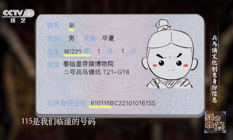 Los primeros seis dígitos en su número de identificación son 610115, los mismos que los residentes en Lintong, y los últimos cuatro dígitos, 6155, son su número de registro. Ahora "vive" en el pozo No.2 del museo, como muestra su carné de identidad.