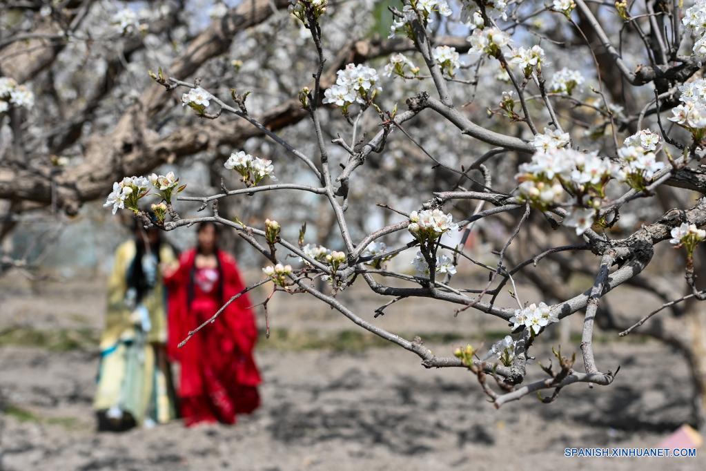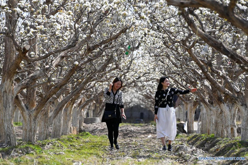 KORLA, 10 abril, 2021 (Xinhua) -- Turistas observan flores de pera, en el municipio de Awat de la ciudad de Korla, en la región autónoma de la etnia uygur de Xinjiang, en el noroeste de China, el 10 de abril de 2021. Ubicada en el extremo norte del desierto Taklamakan, la ciudad de Korla, famosa por sus peras fragantes, es denominada por los residentes como la "Ciudad de la Pera". (Xinhua/Ding Lei)