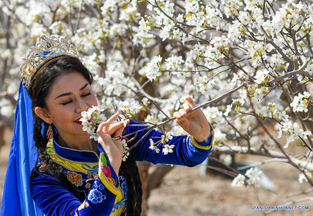 KORLA, 10 abril, 2021 (Xinhua) -- Una bailarina huele flores de pera, en el municipio de Awat de la ciudad de Korla, en la región autónoma de la etnia uygur de Xinjiang, en el noroeste de China, el 10 de abril de 2021. Ubicada en el extremo norte del desierto Taklamakan, la ciudad de Korla, famosa por sus peras fragantes, es denominada por los residentes como la "Ciudad de la Pera". (Xinhua/Zhao Ge)