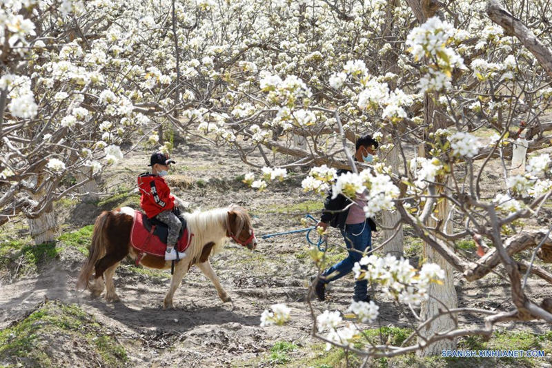 KORLA, 10 abril, 2021 (Xinhua) -- Un ni?o monta un caballo bajo flores de pera, en el municipio de Awat de la ciudad de Korla, en la región autónoma de la etnia uygur de Xinjiang, en el noroeste de China, el 10 de abril de 2021. Ubicada en el extremo norte del desierto Taklamakan, la ciudad de Korla, famosa por sus peras fragantes, es denominada por los residentes como la "Ciudad de la Pera". (Xinhua/Ding Lei)