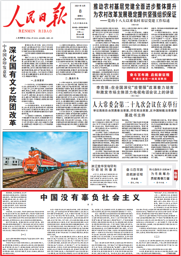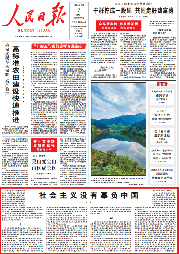 Diario del Pueblo publicó dos comentarios en sus portadas el lunes y martes. Los dos comentarios, titulados “El socialismo no ha fallado a China” y “China no ha fallado al socialismo”, describen la misión inherente del Partido Comunista de China (PCCh) de llevar a China de la adversidad a la prosperidad desde una perspectiva tanto de la historia como de la realidad.