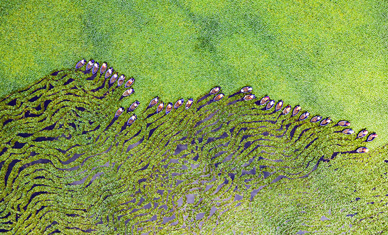 Foto aérea tomada el 22 de agosto de 2021 muestra a personas estacionando vehículos en un paso elevado en Zhengzhou, capital de la provincia de Henan, en el centro de China. (Xinhua / Zhang Haoran)