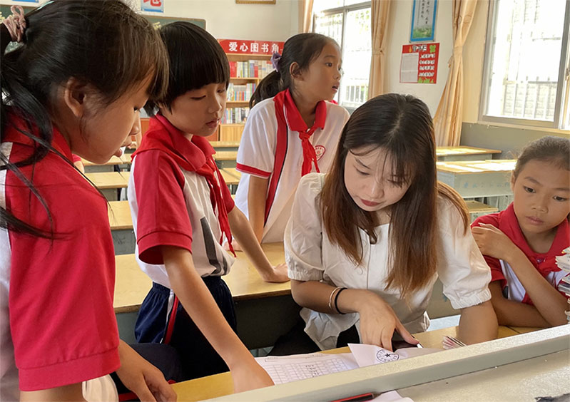 Estudiantes de cuarto grado hacen preguntas a un maestro sobre el nuevo semestre en una escuela primaria en el municipio Yao de Wenming, condado Rucheng de la provincia de Hunan, el 1 de septiembre de 2021. [Foto / Xinhua]
