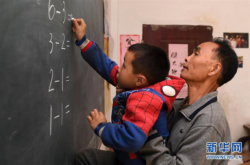 El maestro Zhou Hongjun sostiene a un alumno para ayudarlo a escribir en la pizarra en una escuela de la aldea Xinhe, en el municipio Wangdong, condado autónomo Miao de Rongshui, en la región autónoma Zhuang de Guangxi, el 28 de mayo de 2019. [Foto / Xinhua]