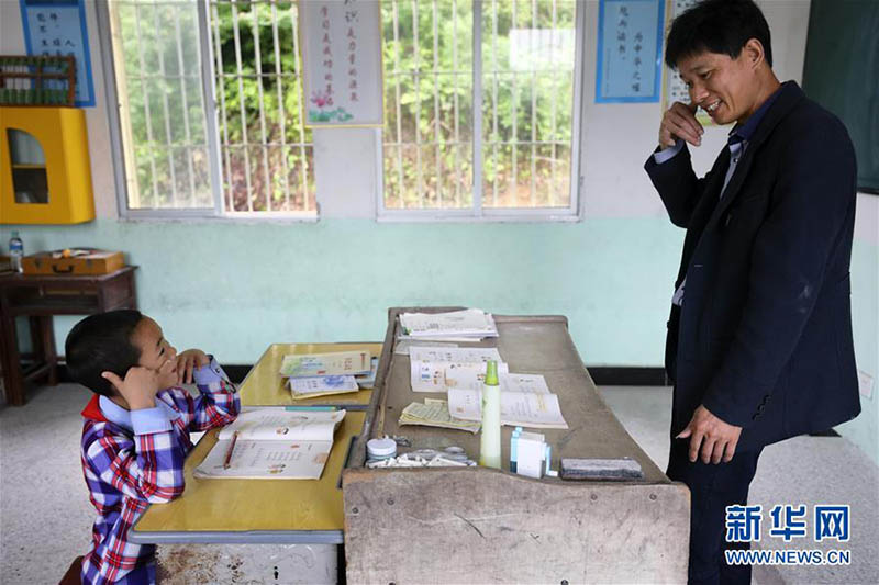 El maestro Wang Beihai ense?a a su alumno Chen Weiyu cómo hacer una llamada telefónica en una escuela primaria en el municipio Dabaidi, ciudad de Ruijin, provincia de Jiangxi, el 8 de mayo de 2019. [Foto / Xinhua]