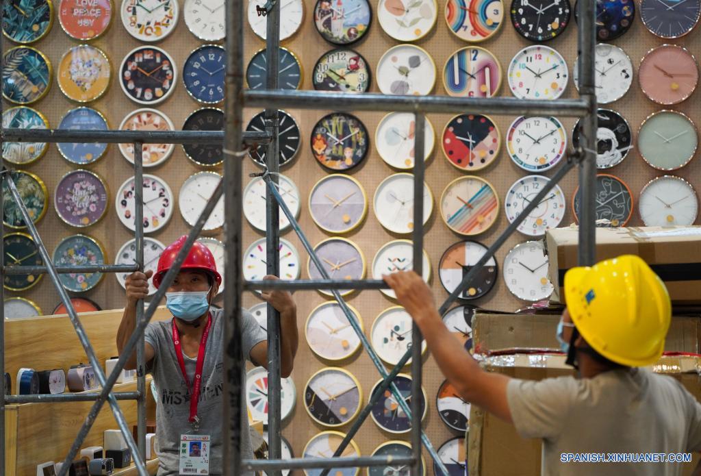 GUANGZHOU, 9 octubre, 2021 (Xinhua) -- Trabajadores preparan muestras en el centro de exhibiciones que hospedará la 130a sesión de la Feria de Importación y Exportación de China, en Guangzhou, en la provincia de Guangdong, en el sur de China, el 9 de octubre de 2021. La feria está programada para abrir el 15 de octubre. (Xinhua/Liu Dawei)