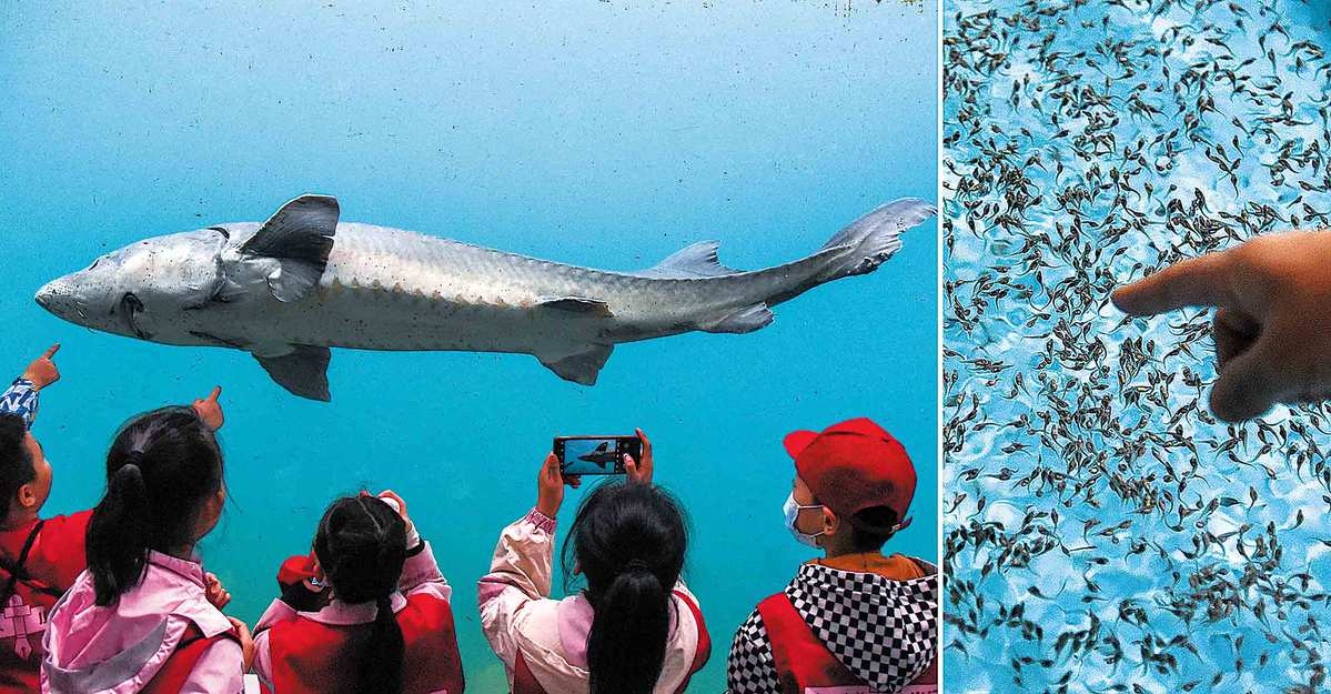 Esturión chino nada en un Centro de Investigación de la Academia de Ciencias Pesqueras de China en Jingzhou, provincia de Hubei. La instalación acaba de lograr la primera eclosión artificial anual de esta especie con un resultado de alrededor de 100.000 alevines (a la derecha). El esturión chino tiene 140 millones de a?os y es uno de los vertebrados vivos más antiguos de la Tierra, 16 de octubre del 2021.