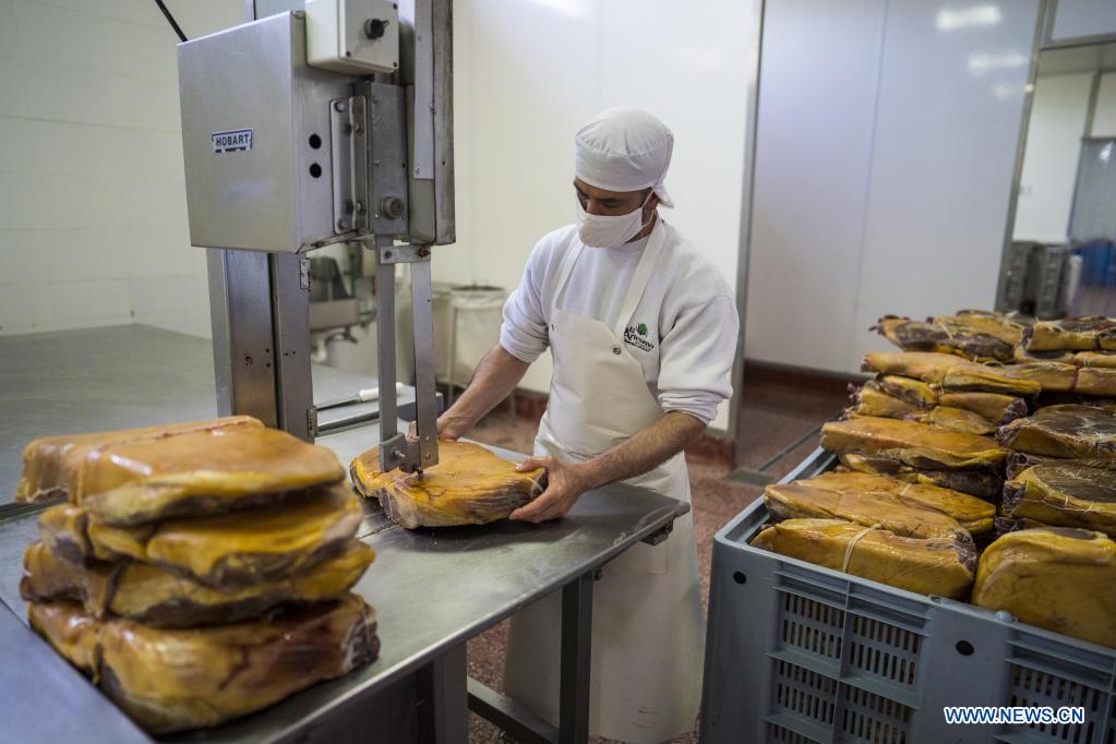 MARCOS PAZ, 3 noviembre, 2021 (Xinhua) -- Imagen del 20 de octubre de 2021 de un empleado cortando una pieza de jamón en el sector de envasado de la empresa El Artesano, en el municipio de Marcos Paz, Argentina. Por segundo a?o consecutivo las peque?as y medianas empresas del municipio Marcos Paz, en la provincia argentina de Buenos Aires, estarán presentes en la Exposición Internacional de Importaciones de China (CIIE, por sus siglas en inglés) que se celebrará del 5 al 10 de noviembre en Shanghai. Uno de los productos emblema del municipio en la CIIE será el Jamón Crudo Argentino, que produce la empresa El Artesano, primer y único jamón premium que cuenta con esta denominación de origen y que además está distinguido con el sello de calidad "Alimentos Argentinos, una Elección Natural" otorgado por el Ministerio de Agricultura, Ganadería y Pesca de este país. (Xinhua/Martín Zabala)