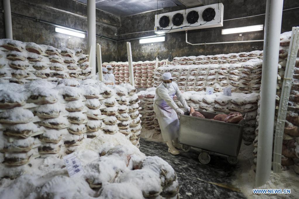 MARCOS PAZ, 3 noviembre, 2021 (Xinhua) -- Imagen del 20 de octubre de 2021 de un empleado trasladando piezas de jamón en la cámara de salado de la empresa El Artesano, en el municipio de Marcos Paz, Argentina. Por segundo a?o consecutivo las peque?as y medianas empresas del municipio Marcos Paz, en la provincia argentina de Buenos Aires, estarán presentes en la Exposición Internacional de Importaciones de China (CIIE, por sus siglas en inglés) que se celebrará del 5 al 10 de noviembre en Shanghai. Uno de los productos emblema del municipio en la CIIE será el Jamón Crudo Argentino, que produce la empresa El Artesano, primer y único jamón premium que cuenta con esta denominación de origen y que además está distinguido con el sello de calidad "Alimentos Argentinos, una Elección Natural" otorgado por el Ministerio de Agricultura, Ganadería y Pesca de este país. (Xinhua/Martín Zabala)