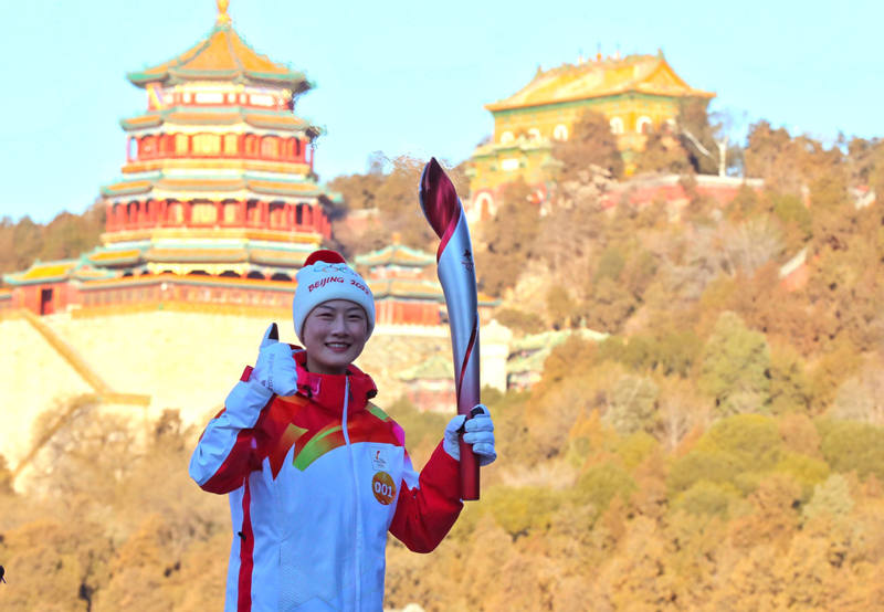 La portadora de la antorcha Ding Ning durante el relevo de la antorcha el 4 de febrero de 2022. [Foto de Jiang Dong/para chinadaily.com.cn]