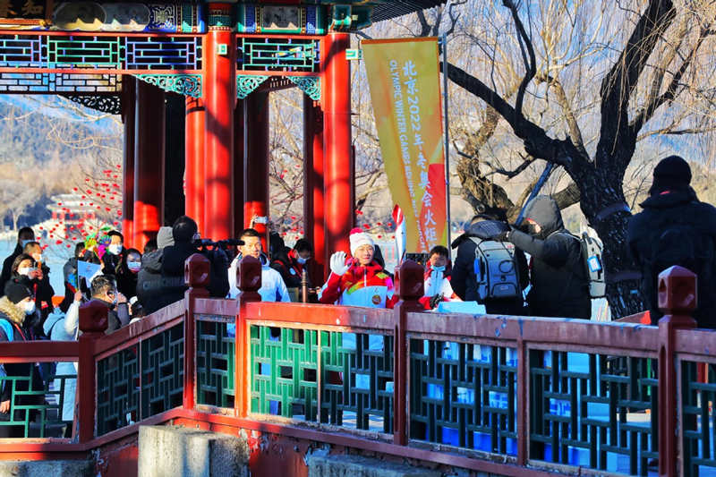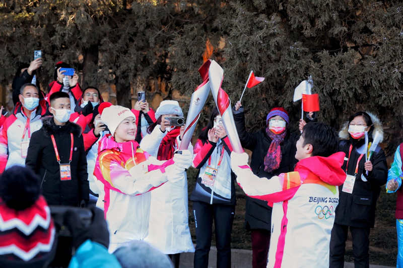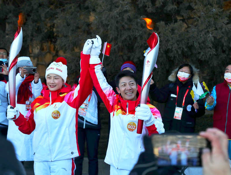 La portadora de la antorcha Ding Ning (izquierda) y Sa Beining escenifican el relevo de la antorcha el 4 de febrero de 2022. [Foto de Jiang Dong/para chinadaily.com.cn]