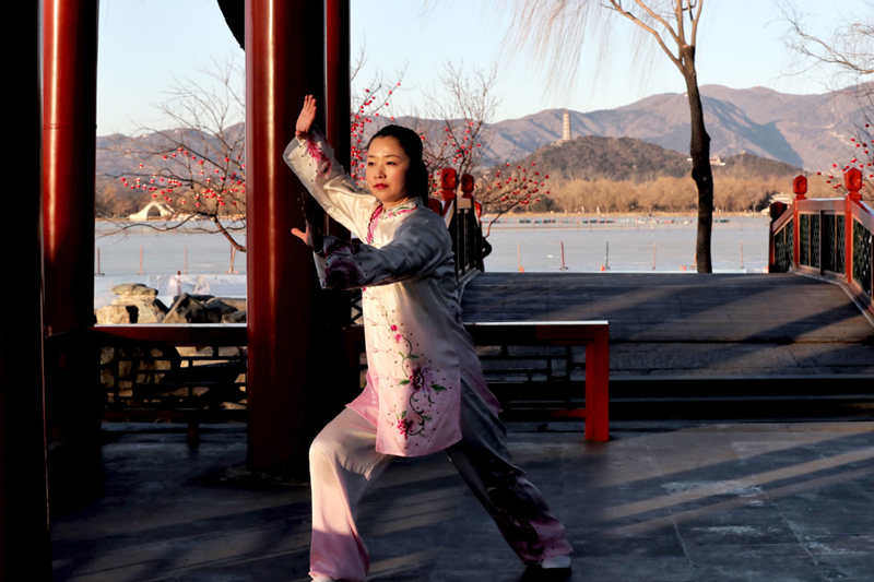 Qiu Huifang, campeona mundial de tai chi, hace tai chi antes del relevo de la antorcha el 4 de febrero de 2022. [Foto de Jiang Dong/para chinadaily.com.cn]
