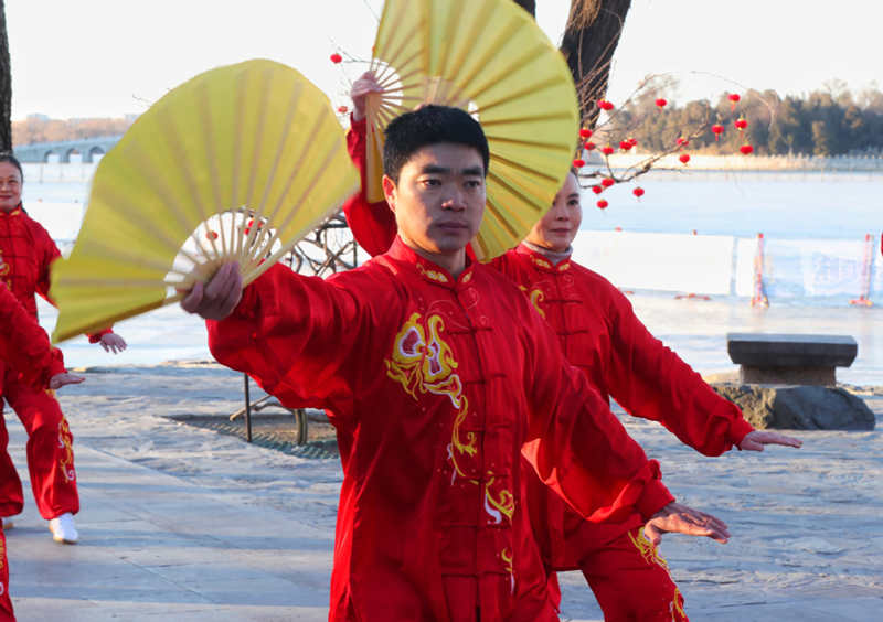 Los aficionados del tai chi actúan antes del relevo de la antorcha en Beijing, el 4 de febrero de 2022. [Foto de Jiang Dong/para chinadaily.com.cn]