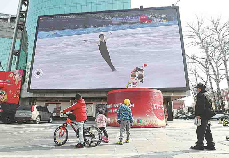 La gente ve una transmisión en vivo de los Juegos Olímpicos de Invierno de Beijing 2022 en una pantalla grande de 8K instalada fuera de un centro comercial en Beijing. [Foto: Zou Hong/ China Daily]