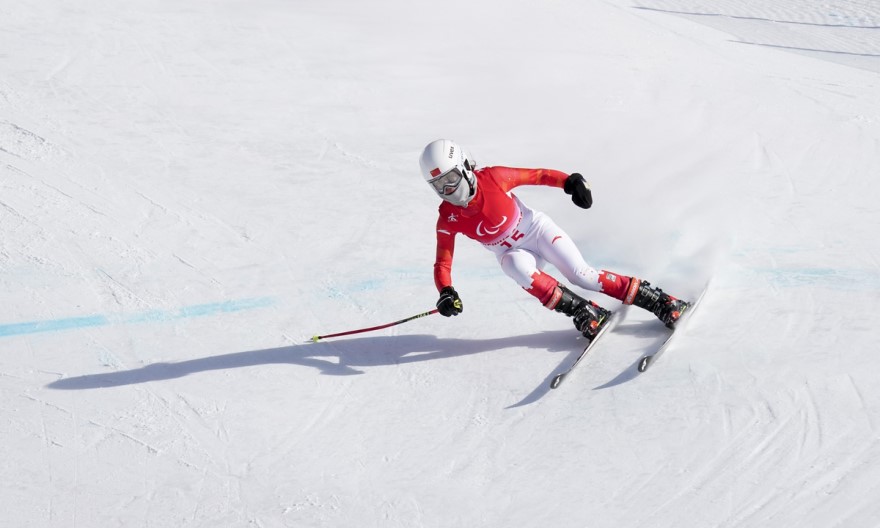 Liang Jingyi compite en el esquí alpino de pie super-G masculino en el Centro Nacional de Esquí Alpino de Yanqing, 6 de marzo del 2022. (Foto: VCG)