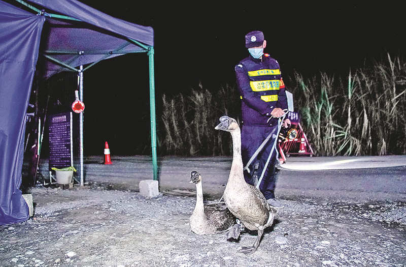 Oficial de la patrulla fronteriza trabaja con dos gansos en Chongzuo, región autónoma Zhuang de Guangxi, enero del 2022. [Foto: Chen Guanyan/Servicios de Noticias de China]