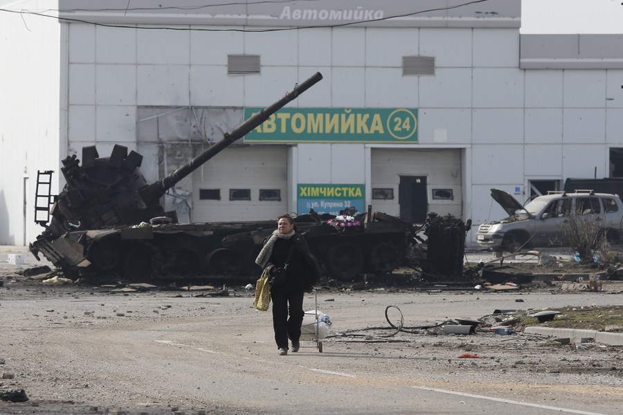 Imagen del 25 de marzo de 2022 de una mujer caminando cerca de los restos de un tanque, en Mariúpol, una ciudad portuaria en Donetsk. (Xinhua/Victor)