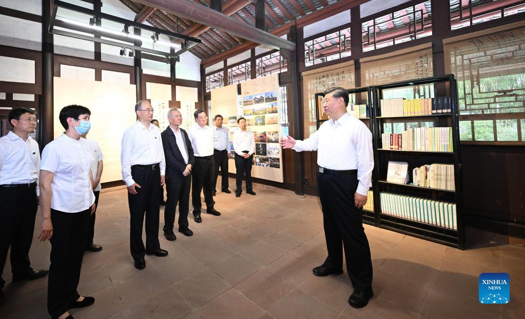 El presidente chino, Xi Jinping, también secretario general del Comité Central del Partido Comunista de China y presidente de la Comisión Militar Central, visita San Su Ci, el templo conmemorativo y antigua residencia de Su Xun y sus dos hijos Su Shi y Su Zhe, tres maestros de la literatura de la Dinastía Song del Norte (960-1127), para conocer los esfuerzos locales para proteger el patrimonio histórico y cultural, en Meishan, en la provincia de Sichuan, en el suroeste de China, el 8 de junio de 2022. Xi inspeccionó el miércoles la ciudad de Meishan. (Xinhua/Li Xueren)