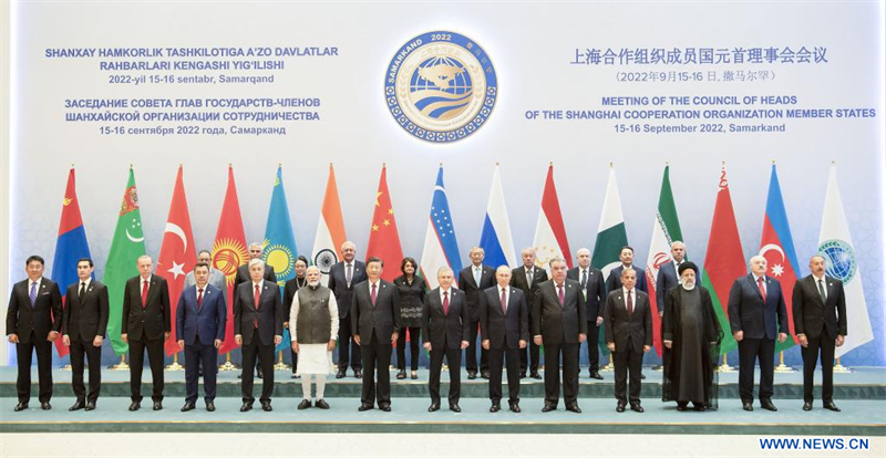 El presidente chino, Xi Jinping, posa para una foto de grupo con otros líderes e invitados antes de la XXII Reunión del Consejo de Jefes de Estado Miembros de la Organización de Cooperación de Shanghai, en Samarcanda, Uzbekistán, el 16 de septiembre de 2022. Xi asistió a la reunión y pronunció un discurso. (Xinhua/Li Tao)