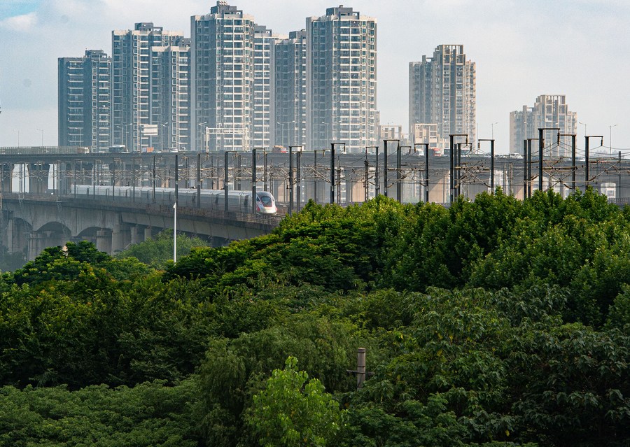 Un tren de alta velocidad circula por la línea ferroviaria Beijing-Guangzhou, el 20 de junio de 2022. (Xinhua/Xiao Yijiu)