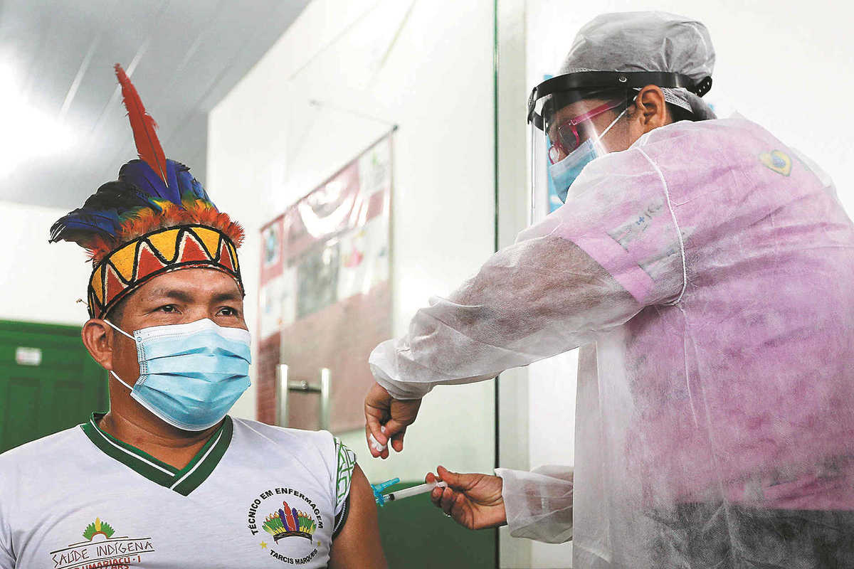Un trabajador médico inocula a un indígena con una vacuna contra el COVID-19 fabricada en China en Tabatinga, Brasil, en 2021. LUCIO TAVORA/XINHUA