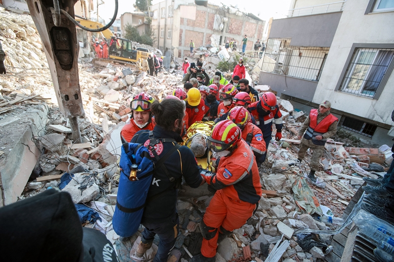 Rescatistas chinos y turcos trasladan a una persona herida que fue rescatada de los escombros en Antakya, Turquía, el 12 de febrero, seis días después de que dos poderosos terremotos sacudieran el país y la vecina Siria. [FOTO/XINHUA]